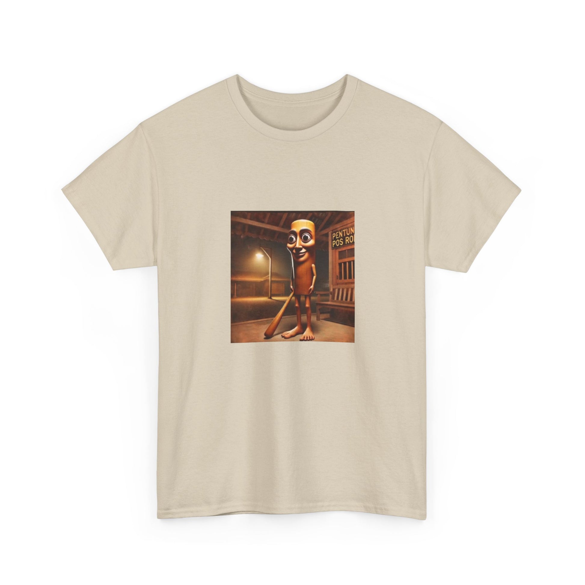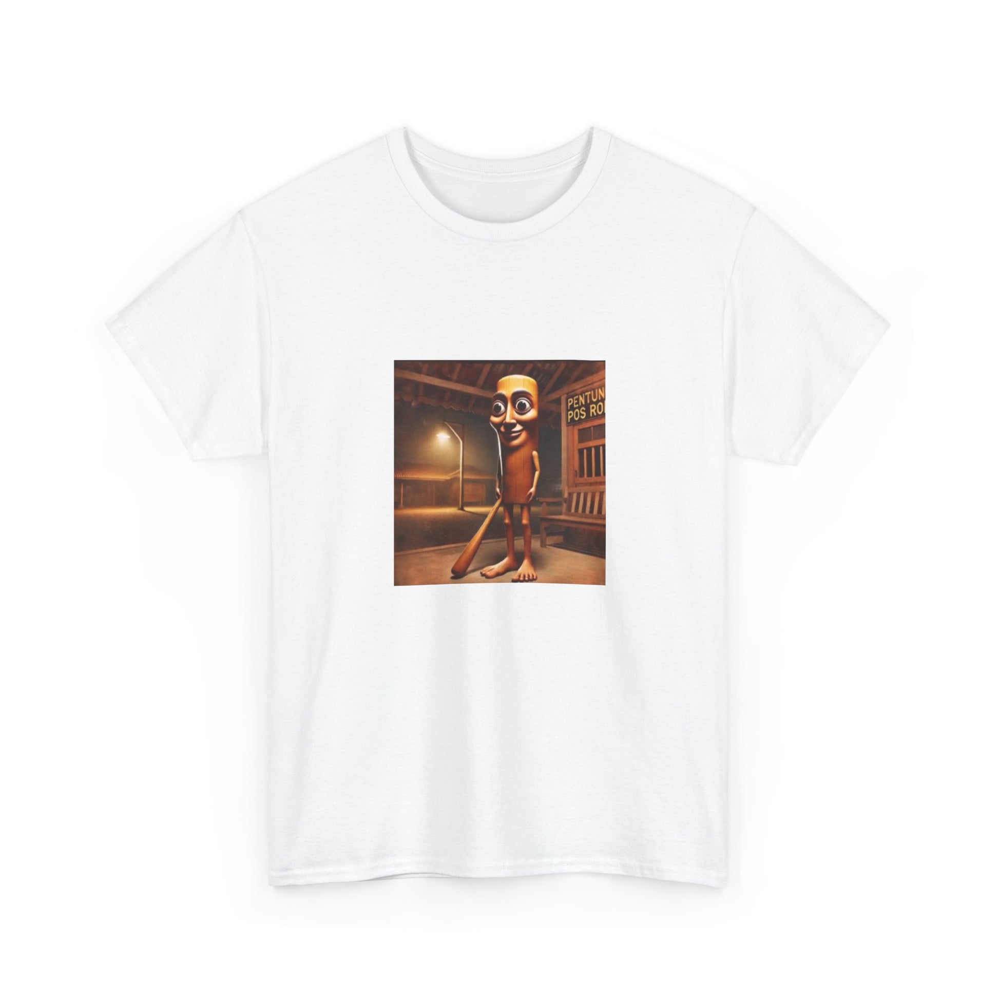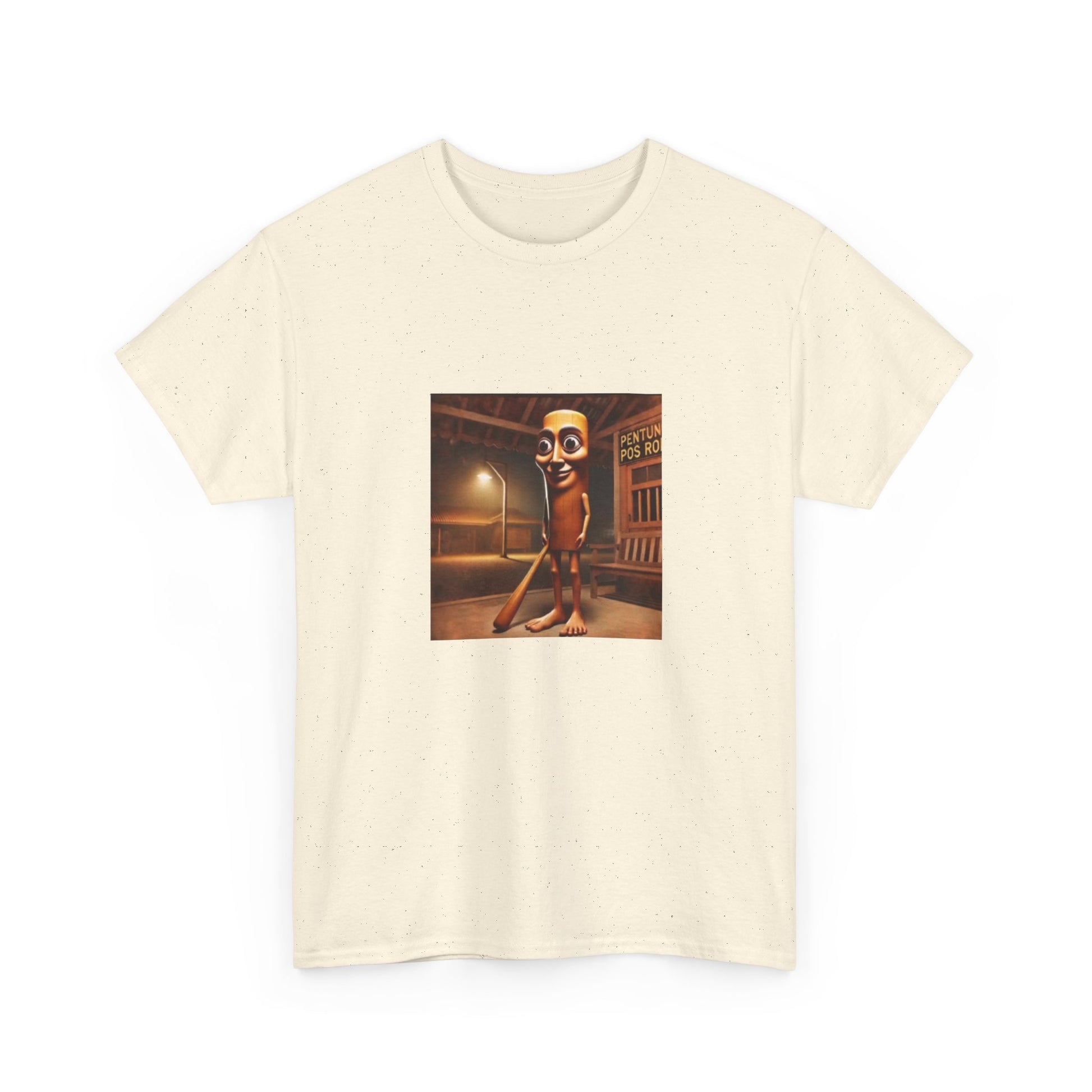 This relaxed cotton tee carries a quirky, nostalgic illustration at chest height — a late-night street scene with a vintage cinematic glow and a character that feels both uncanny and oddly charming. The medium-weight fabric and classic crew neck make it comfortable for long wear, while the square, centered art keeps the look conversational and art-forward. Wear it when you want to spark curiosity on an evening walk, at a low-key gallery night, or when layering under a jacket for a retro-inspired outfit. The tear-away label and ribbed collar keep the shirt comfortable; the sturdy knit and reinforced shoulder tape mean the piece will keep its shape through many washes. Ethically sourced cotton and thoughtful printing methods give the design crisp detail and a responsible production story.