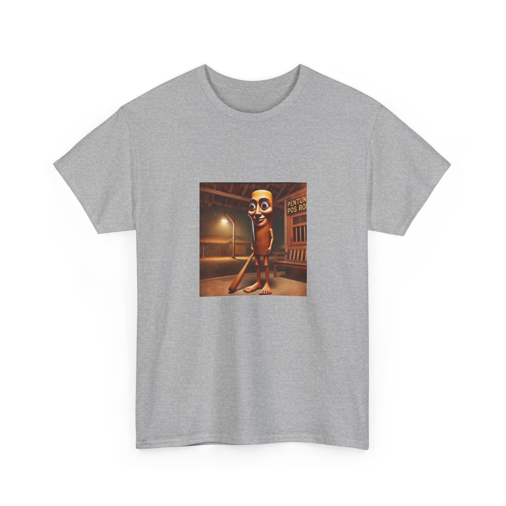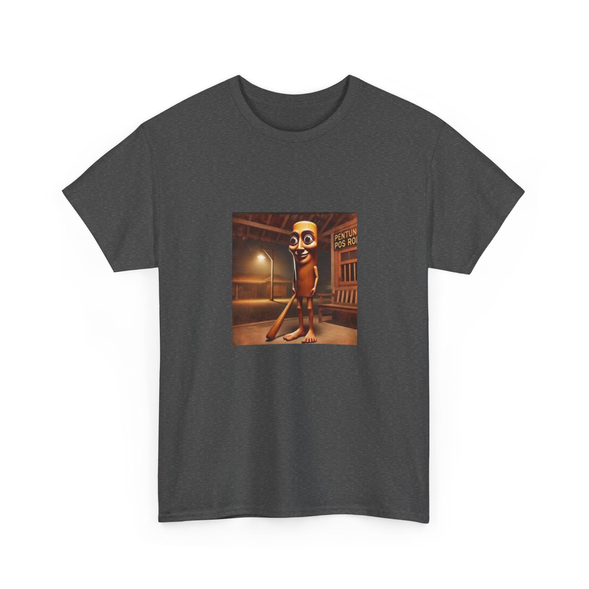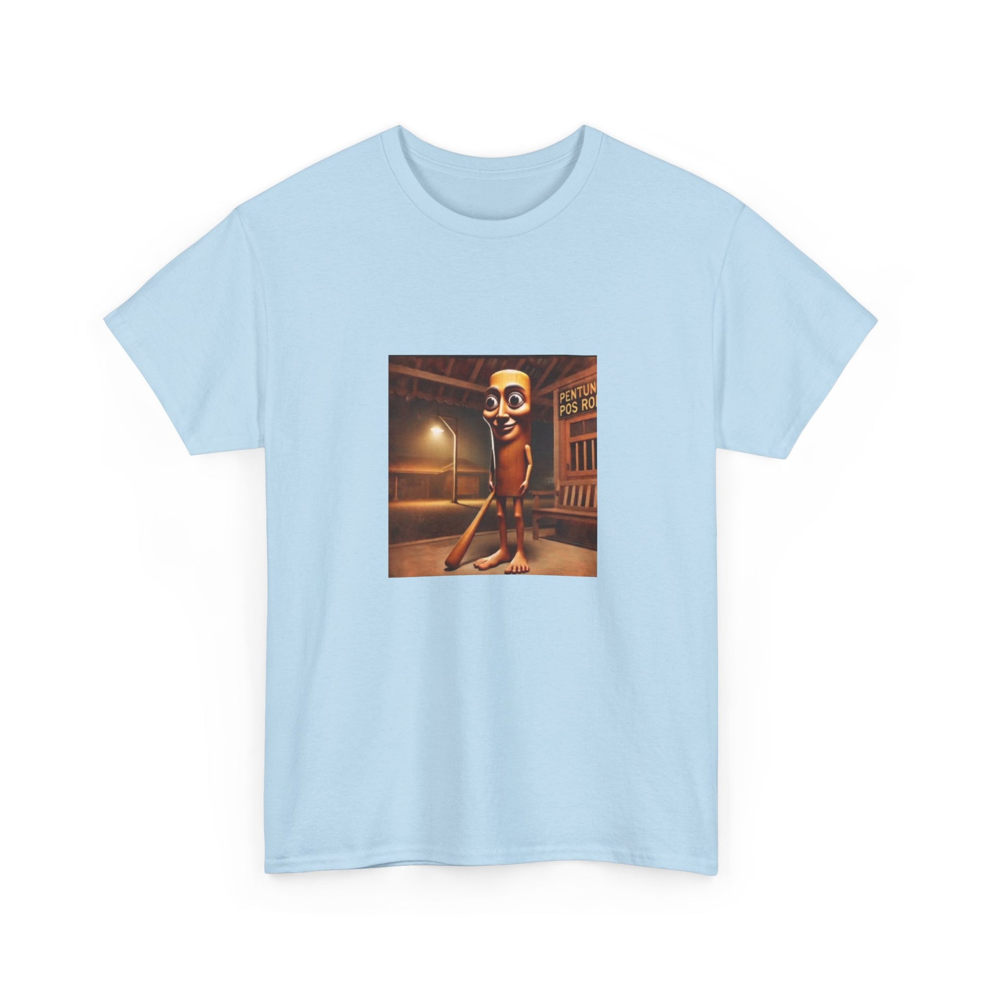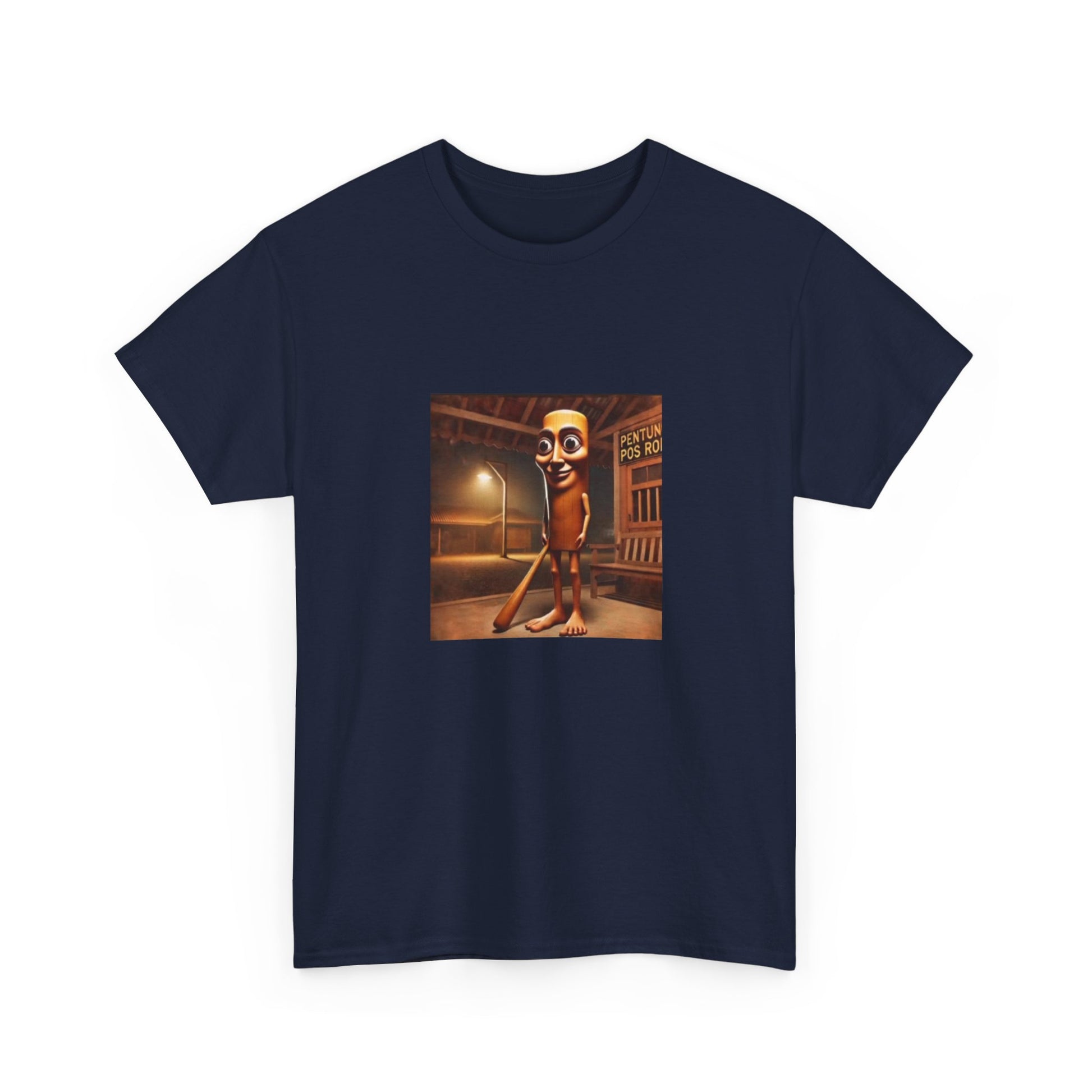 This relaxed cotton tee carries a quirky, nostalgic illustration at chest height — a late-night street scene with a vintage cinematic glow and a character that feels both uncanny and oddly charming. The medium-weight fabric and classic crew neck make it comfortable for long wear, while the square, centered art keeps the look conversational and art-forward. Wear it when you want to spark curiosity on an evening walk, at a low-key gallery night, or when layering under a jacket for a retro-inspired outfit. The tear-away label and ribbed collar keep the shirt comfortable; the sturdy knit and reinforced shoulder tape mean the piece will keep its shape through many washes. Ethically sourced cotton and thoughtful printing methods give the design crisp detail and a responsible production story.